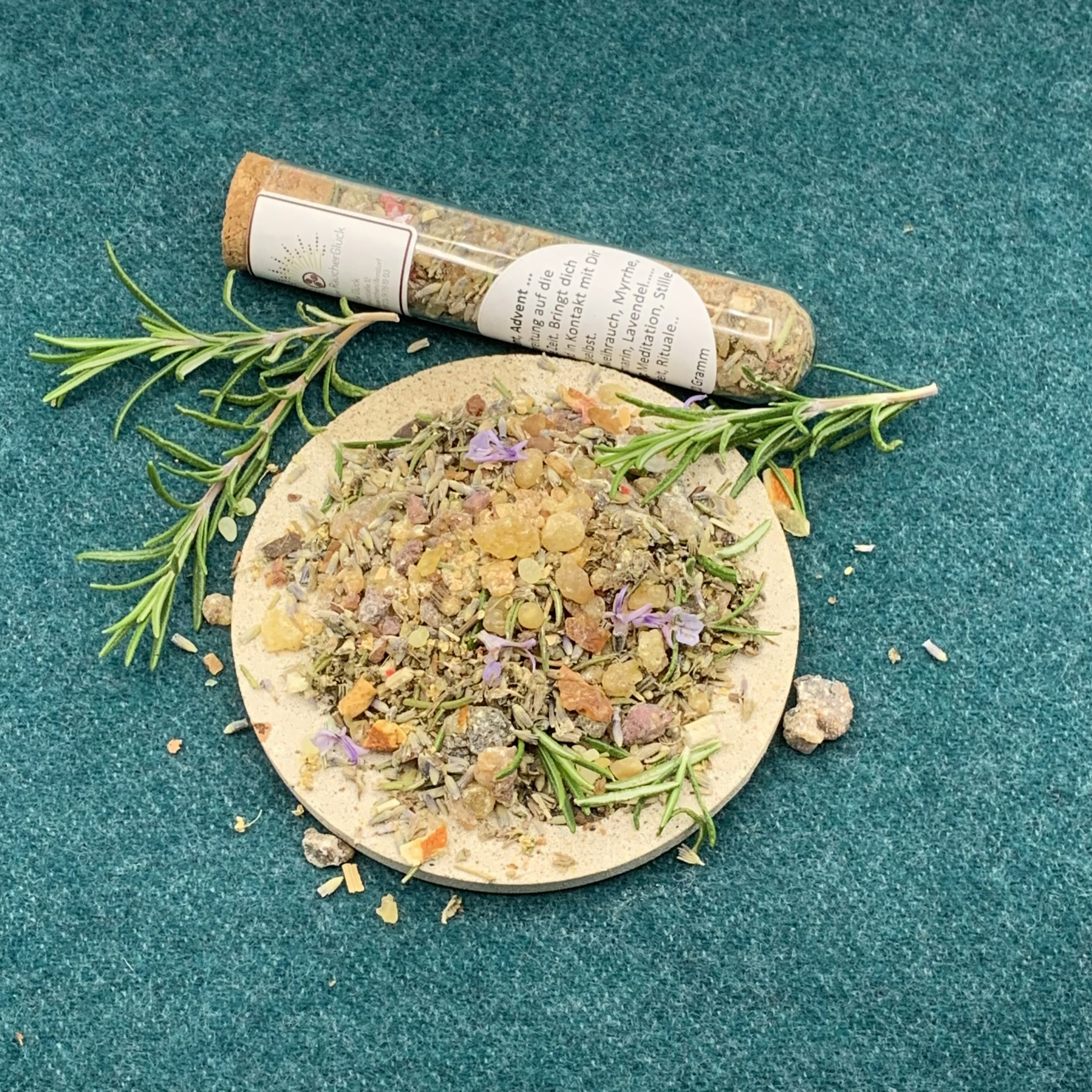 Diese Räuchermischung für die Adventszeit verbindet warmen Waldweihrauch, Myrrhe und klärende Kräuter zu einem harmonischen Dufterlebnis. Rosmarin, Beifuß und Lavendel fördern Ruhe, Klarheit und eine wohltuende Atmosphäre. Ideal für Meditation, Adventsrituale oder zur Einstimmung auf die Festtage – eine hochwertige, handgemachte Mischung für eine bewusste und besinnliche Adventszeit.